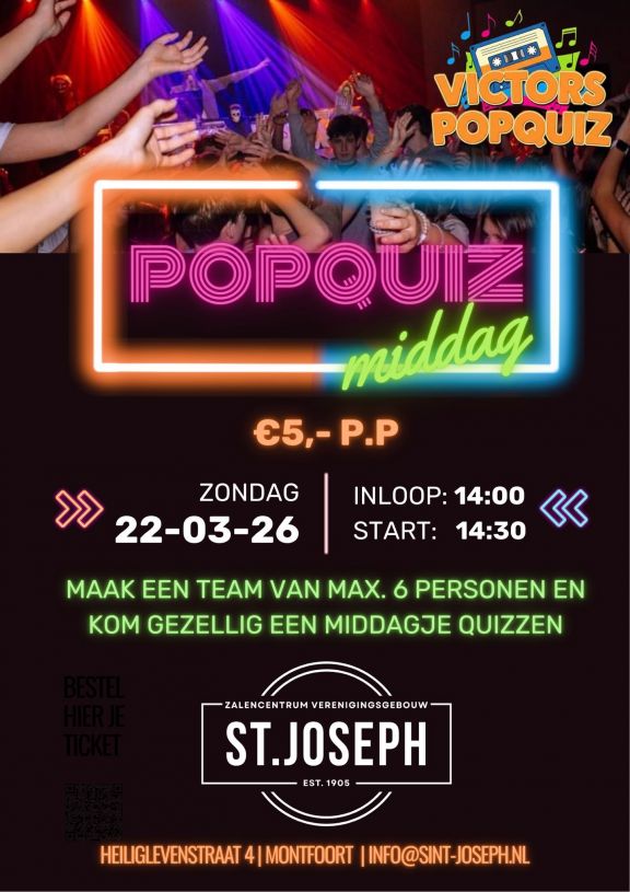 Op zondag 22 maart presenteert Victor Verseveldt de enige echte popquiz in het St. JosephMet deze muziekquiz kunt u een veelzijdige quiz verwachten, van pop tot punk, van sixties tot vandaag, van…